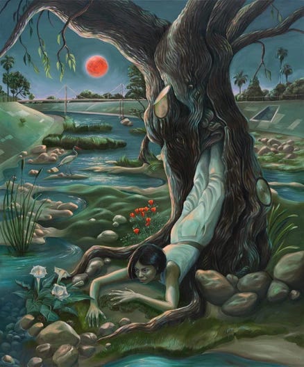 The series concludes with "Blood Orange Moon" and its subtext, "Treebirth." In this final painting, the figure is reborn from a tree, symbolizing renewal and the cycle of life. The transition from night to dawn represents reincarnation and a new beginning, capturing the essence of rebirth and the perpetual nature of transformation.